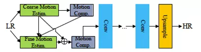 VESPCN即Video efficient sub-pixel convolutional network,引入了一个空域运动补偿变换模块(MCT),运动补偿后的帧作为卷积网络的输入,再经过特征提取和融合,最后经过一个亚像素卷积层做上采样得到高分辨率视频。MCT模块采用CNN由粗到精来提取运动信息、进行运动补偿。粗估网络以2个连续帧作为输入,经过5层卷积和1层亚像素卷积,得到粗略的光流运动信息,然后进行运动补偿。粗估网络的输入为粗估网络得到的光流信息和运动补偿帧,经过卷积网络得到更精细的运动信息和运动补偿帧。